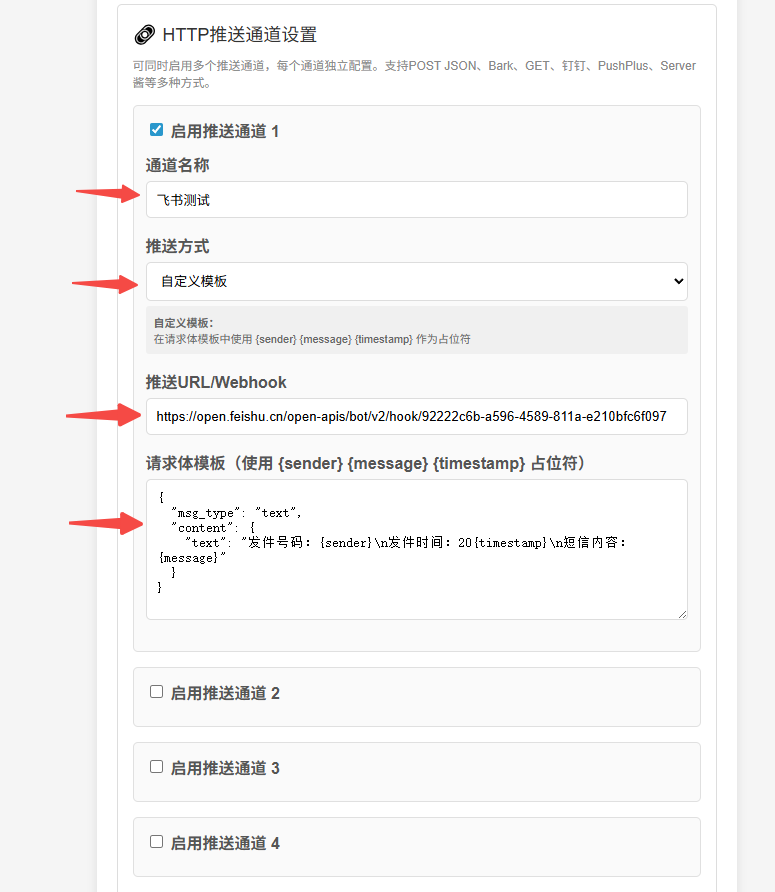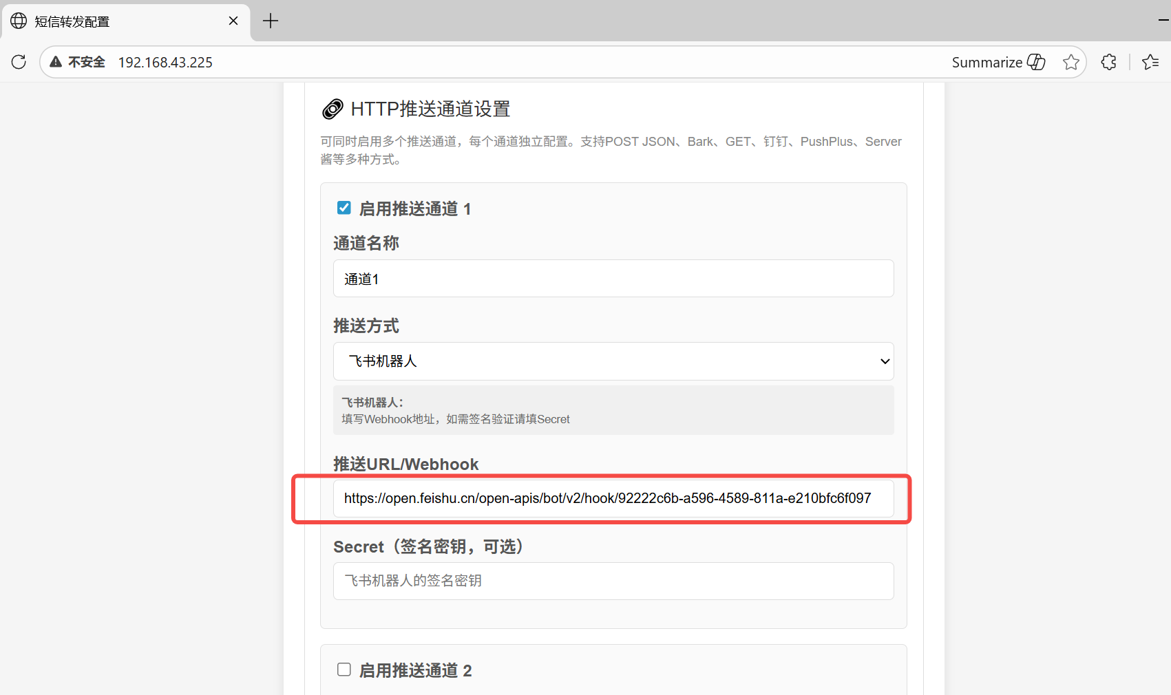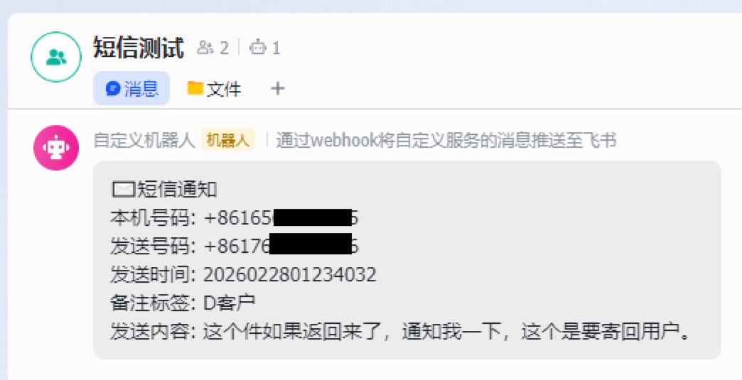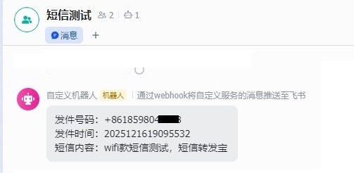 短信宝可实现短信转发到邮箱、钉钉、微信、飞书…,下面以飞书为例子: