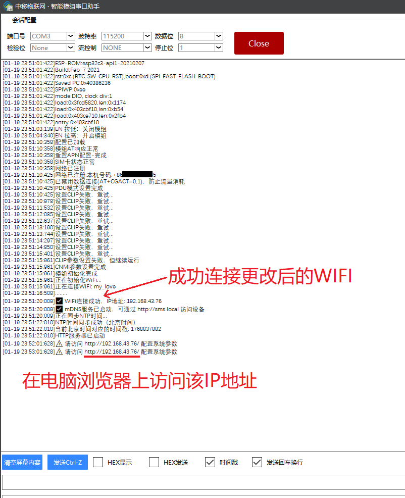 - 打印日志(要看到下面WIFI连接成功)(如果不成功,请确认WIFI是2.4G的WIFI)